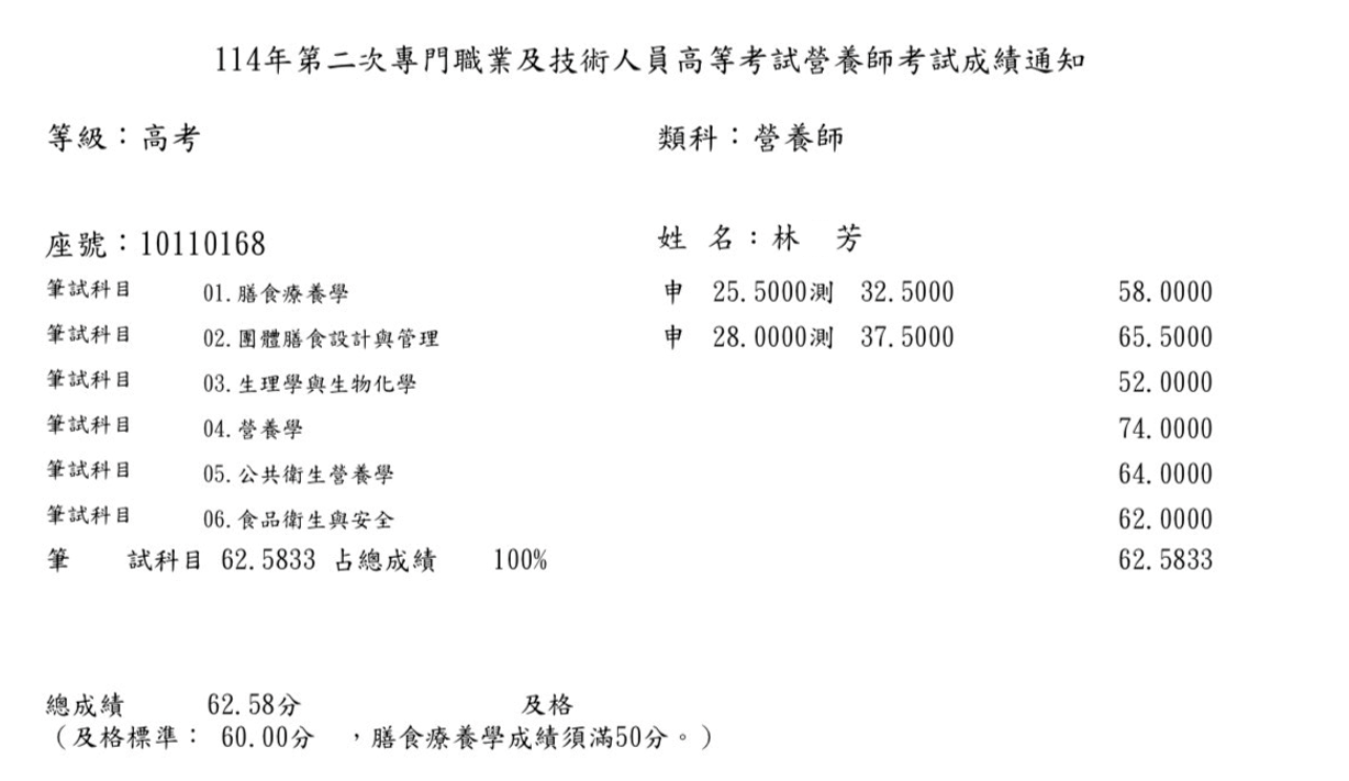 【114年第二次營養師國考】張OO營養師上榜心得
