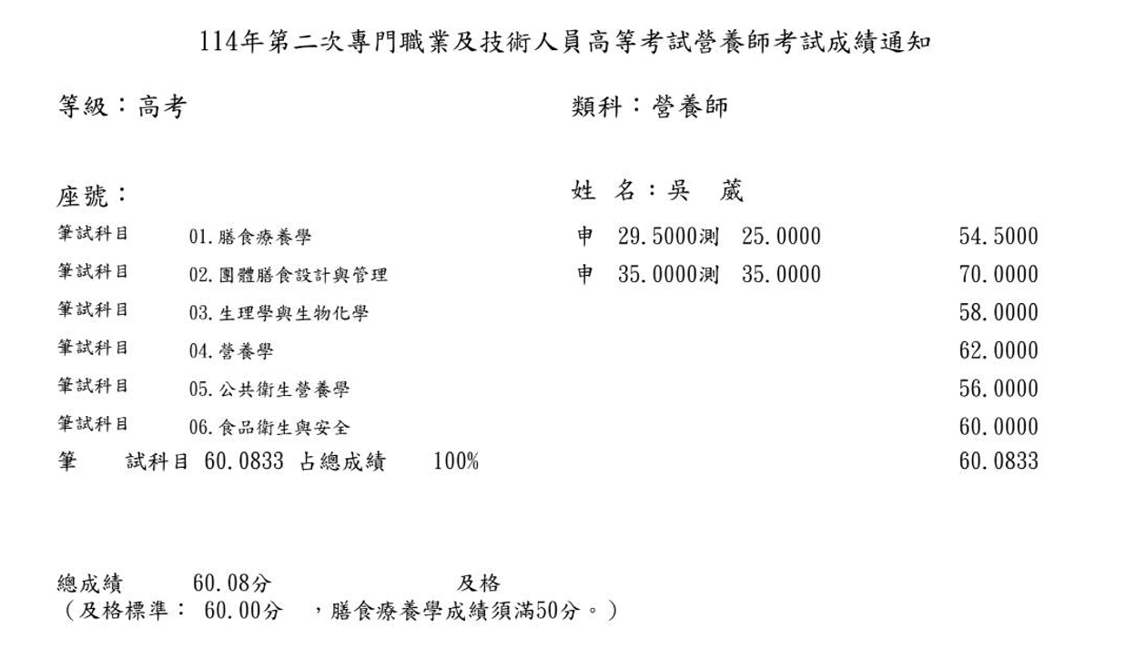 【114年第二次營養師國考】林O芳營養師上榜心得